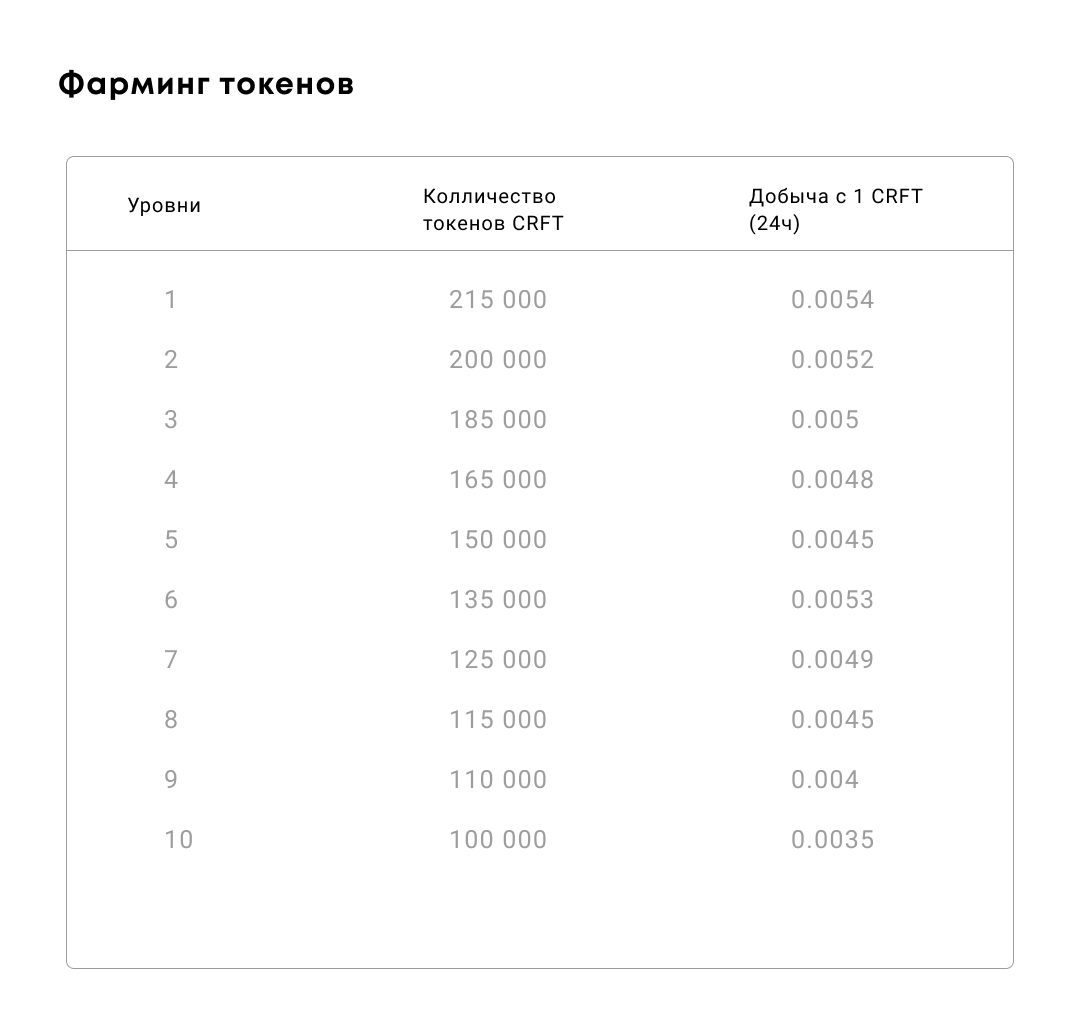 Добытые CRFT возможно вывести один раз в сутки. Вывод можно совершить в любое время, но следующий не раньше, чем через 24 часа.