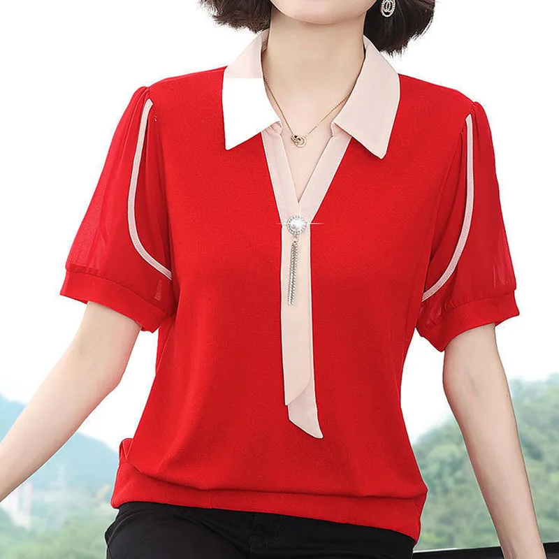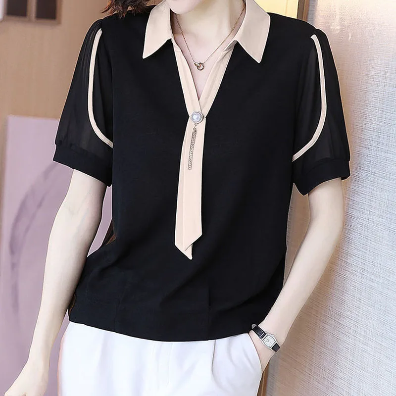 "Fashion Solid Color Patchwork Korean Turn-down Collar Button Shirt Pullovers Commuter Summer Women's Clothes Elegant Blouses 4XL" * Buy Now Just For 14$