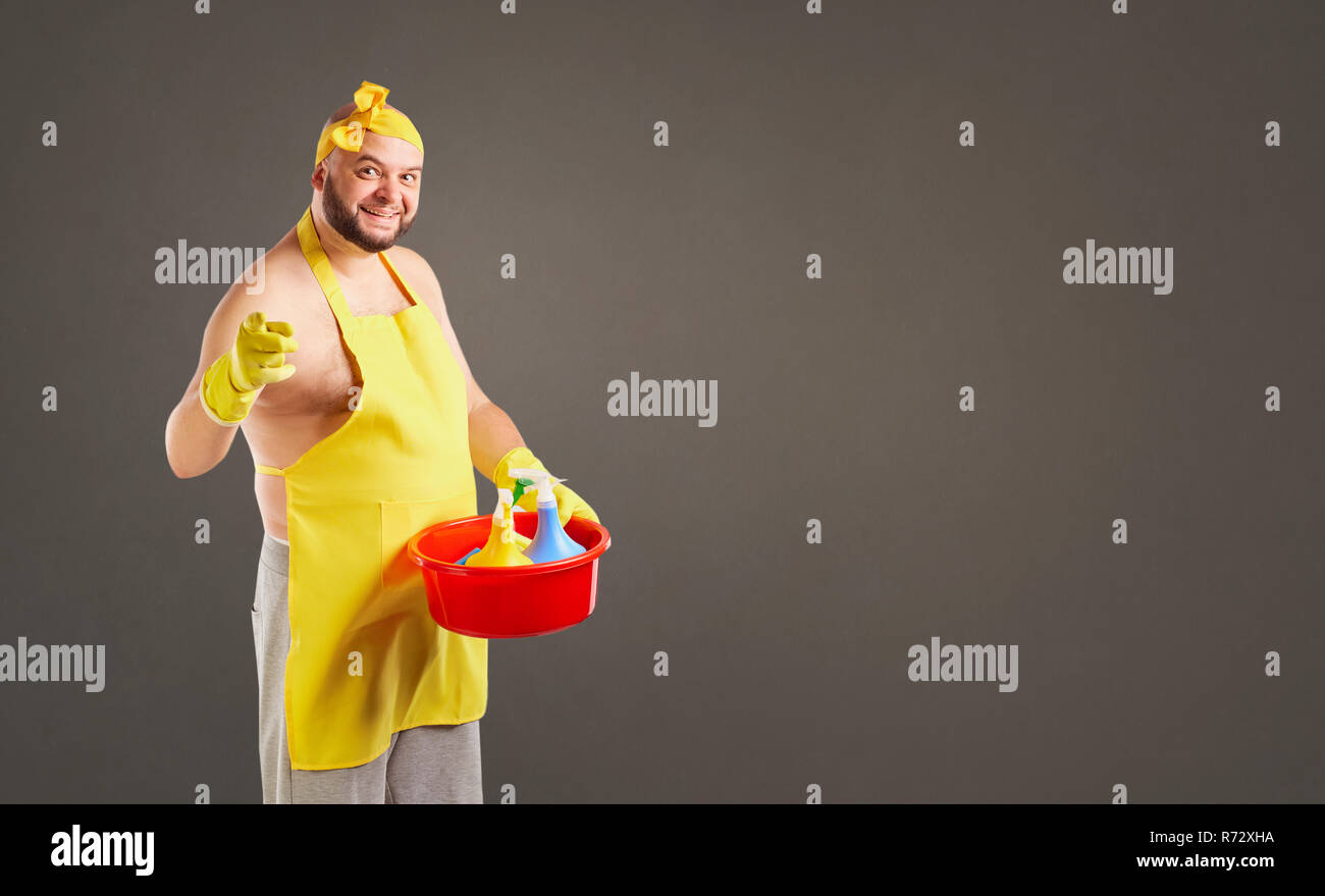 Happy fat Asian cleaning lady smiling while wearing maid co
