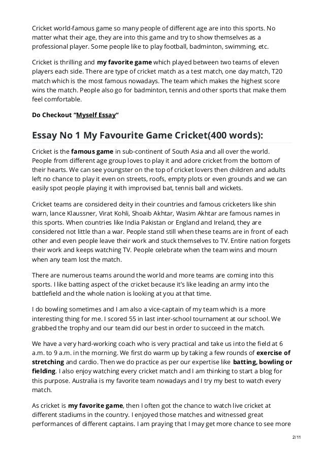 All custom essays are written by professional . My favourite sport is Cricket . Cricket is a wonderful game between the two teams . Each team will have eleven players and two to three substitutes . Out eleven players five to six players will be bats men, and the rest will be a bowlers and fielders and one wicket keeper .