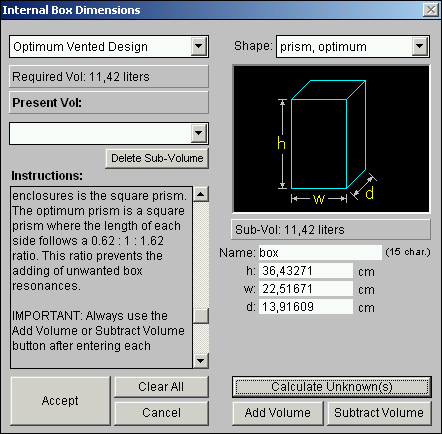 Узконаправленная программа, предназначена для расчета портов фазоинвертора для определенного объема, полноценно корпус в ней не рассчитать . Все внимание направлено на проектирование портов, учитывает воздушные потоки, формы, расстояния до стенок и перегородок .