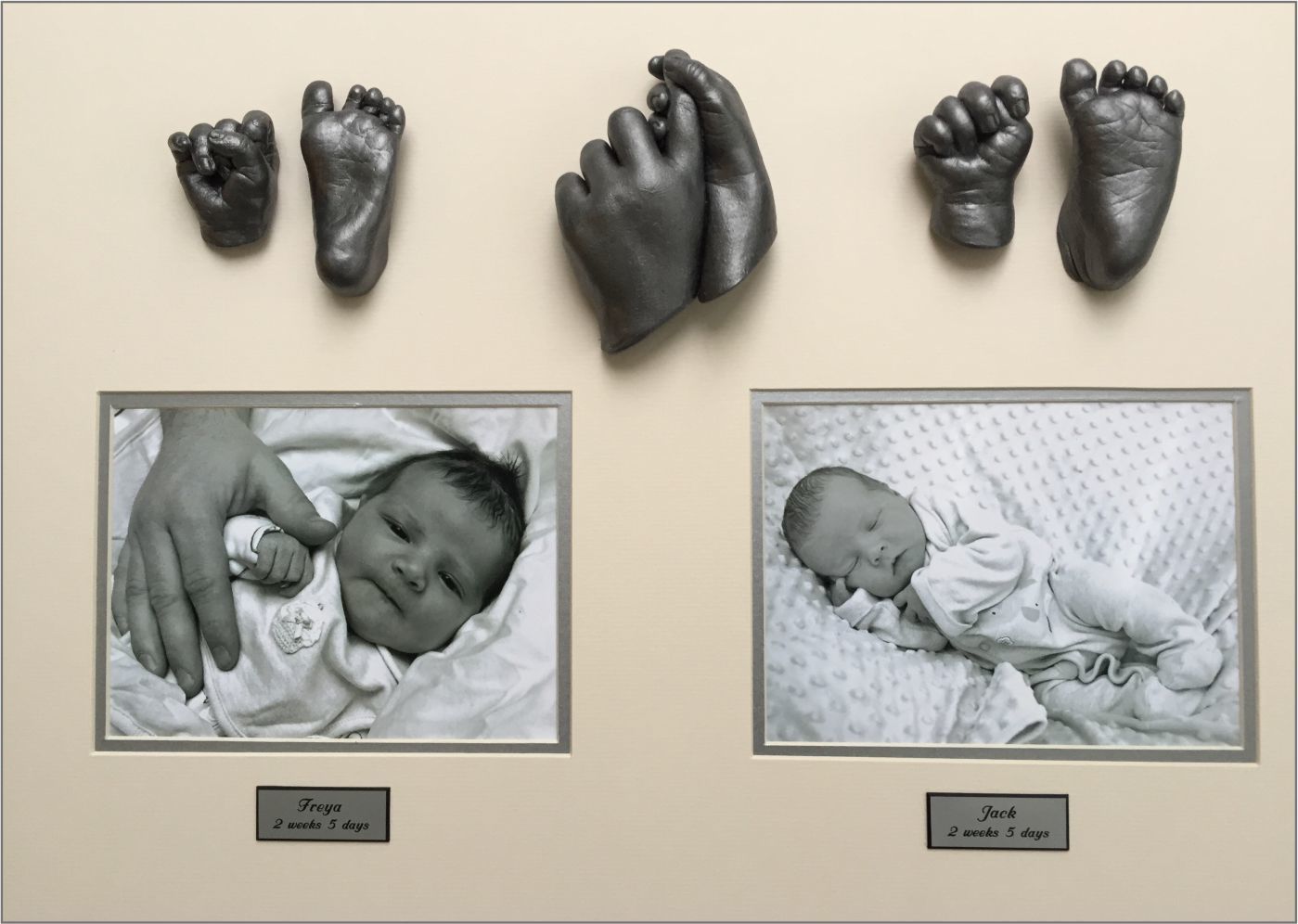 The rubber-like plaster makes it quick and easy to mold your baby's hands or feet . This kit contains the materials to do 2 complete 3D baby hand and foot castings . You can, therefore, cast either two hands, two feet or one hand and one foot .