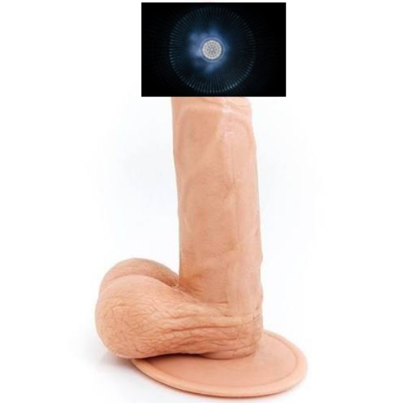 A realistic dildo is a sex toy that has been designed to look and feel like a real penis, with a flexible shaft and realistic vein details . It's usually flesh colored and quite often comes with a pair of lifelike balls attached, too .