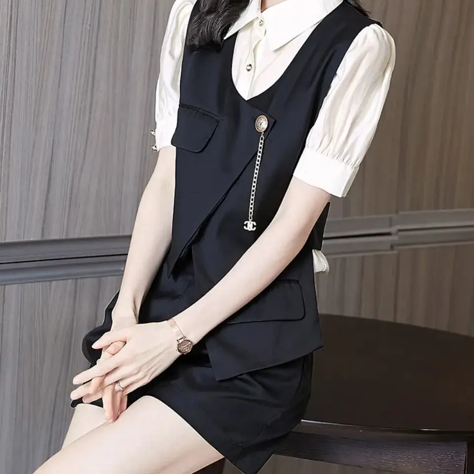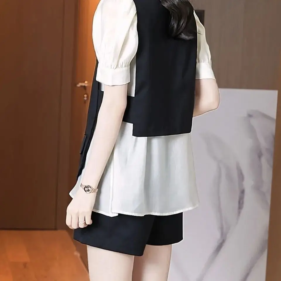Female Clothing Vintage Solid Color Three-piec Matching Sets Button Fashion Asymmetrical Patchwork Summer All-match Short Sets - Купить с бесплатной доставкой