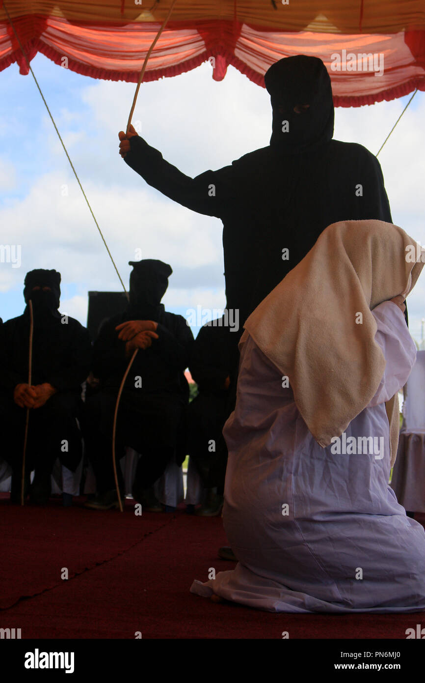 A WEEPING woman breaks down as she is brutally whipped 100 times in public for having pre-marital sex in Indonesia . Harrowing photos show the 22-year-old wincing in pain and begging for mercy as . . .