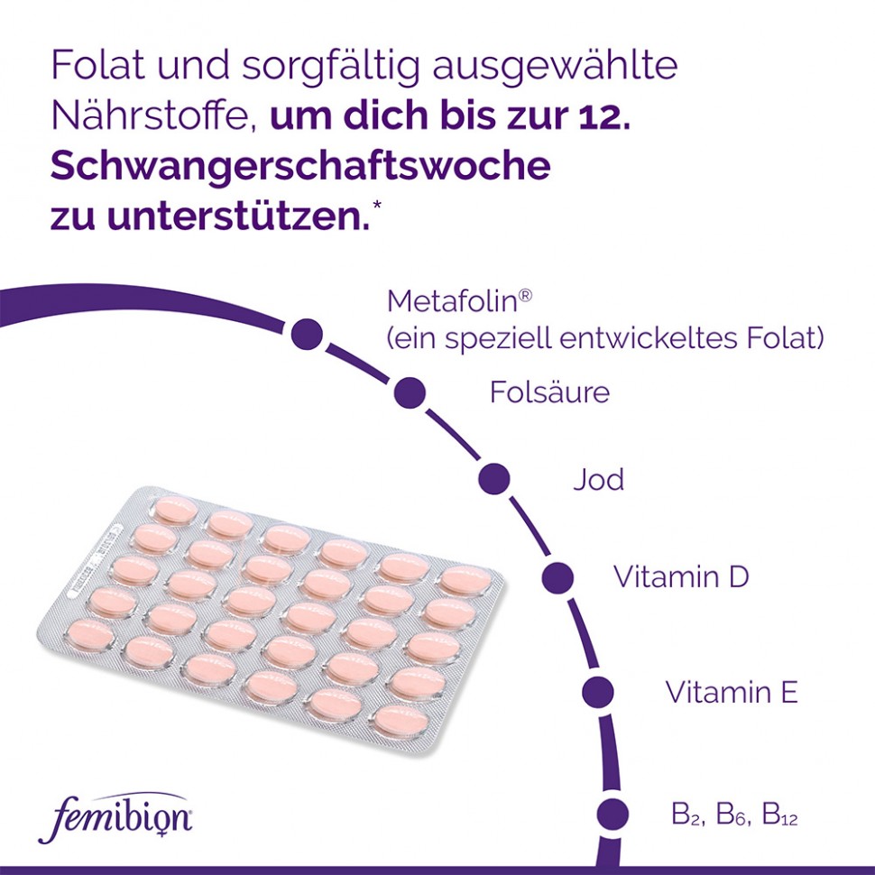 Фемибион® 1 №28 . Фемибион ® 1 №28 обеспечивает женщину и фолиевой кислотой (200 мкг), и биологически активными фолатами (200 мкг Метафолина), чтобы создать оптимальные условия для рождения здорового ребенка . Это касается даже тех, у кого активность фермента снижена .