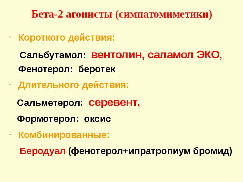 Это избирательные b 2-миметики .Действие на сердце незначительное . Наибольшей селективностью в отношении β 2-рецепторов бронхов обладают сальбутамол и сальметерол, а в отношении β 2-рецепторов матки - гинипрал .