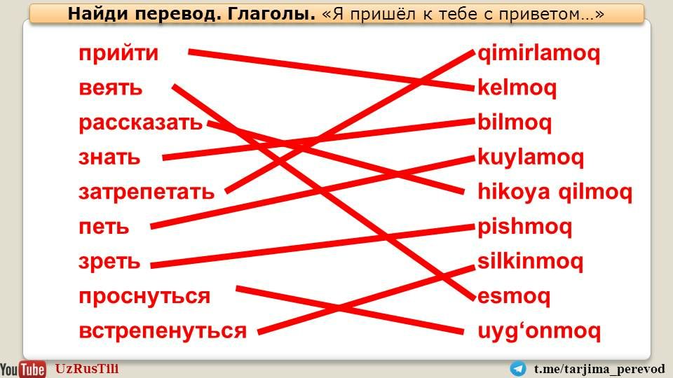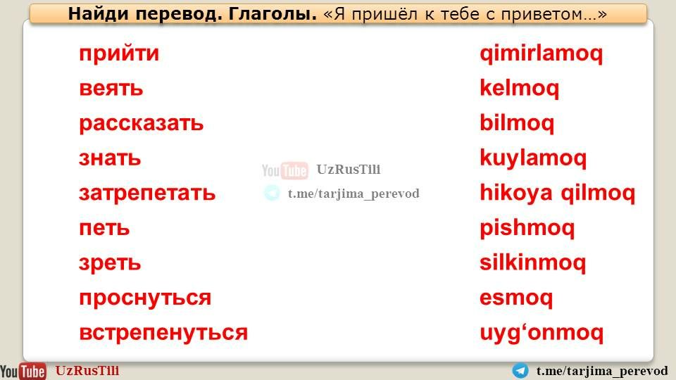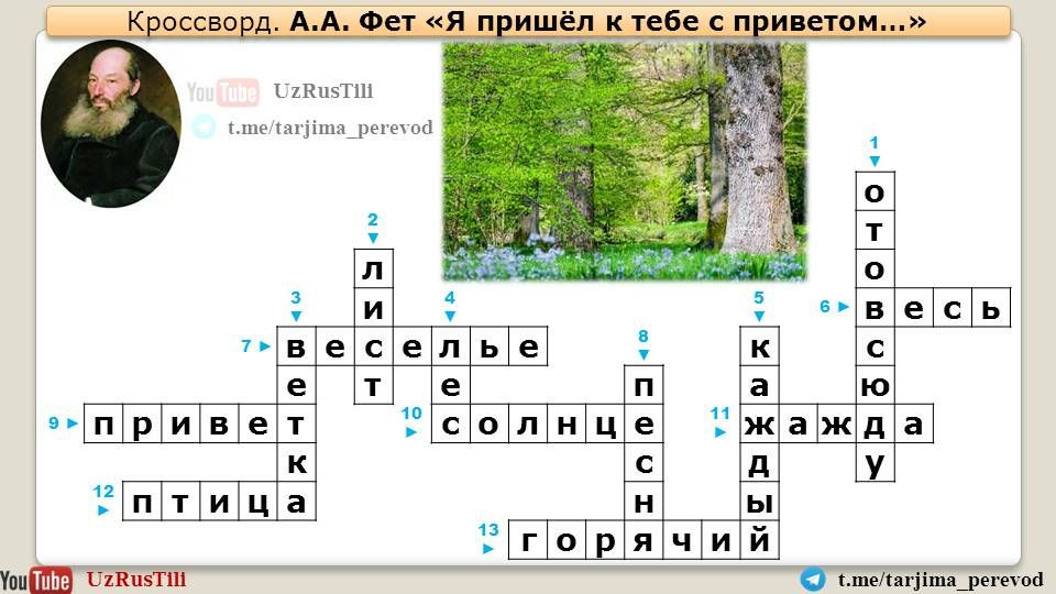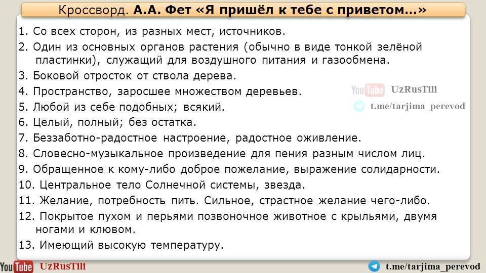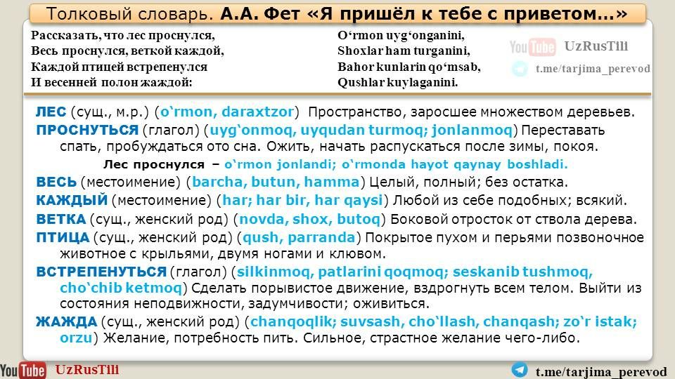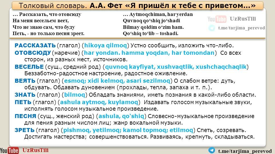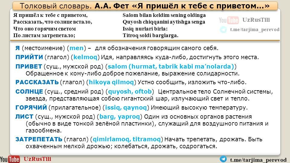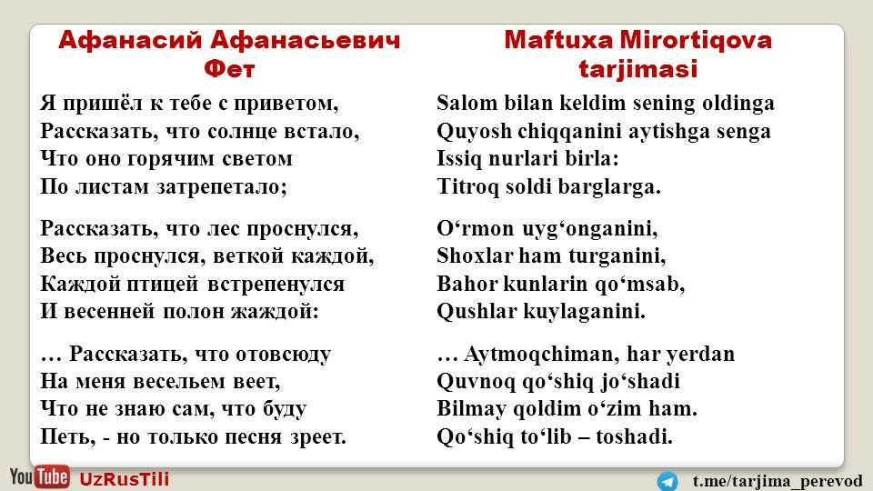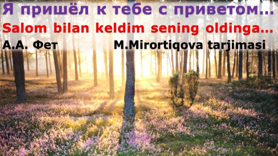 Перевод 🇺🇿🇺🇸🇷🇺 Таржима саньатиТелеграм канал https://t.me/tarjima_perevod и ютуб канал UZRUSTILI https://youtu.be/fNSEyNSvuYk представляют перевод на узбекский язык стихотворения Афанасия Фета "я пришёл к тебе с приветом...". Перевод М. Мирортиковой.