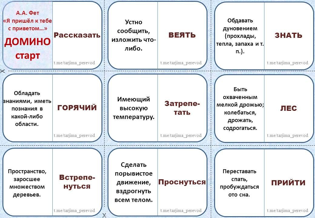 Вначале находим первую карточку (на ней слева написано Домино старт). Справа на ней слово "Рассказать". Учащемуся необходимо найти карточку на которой слева написано опеределение "Устно сообщить..".