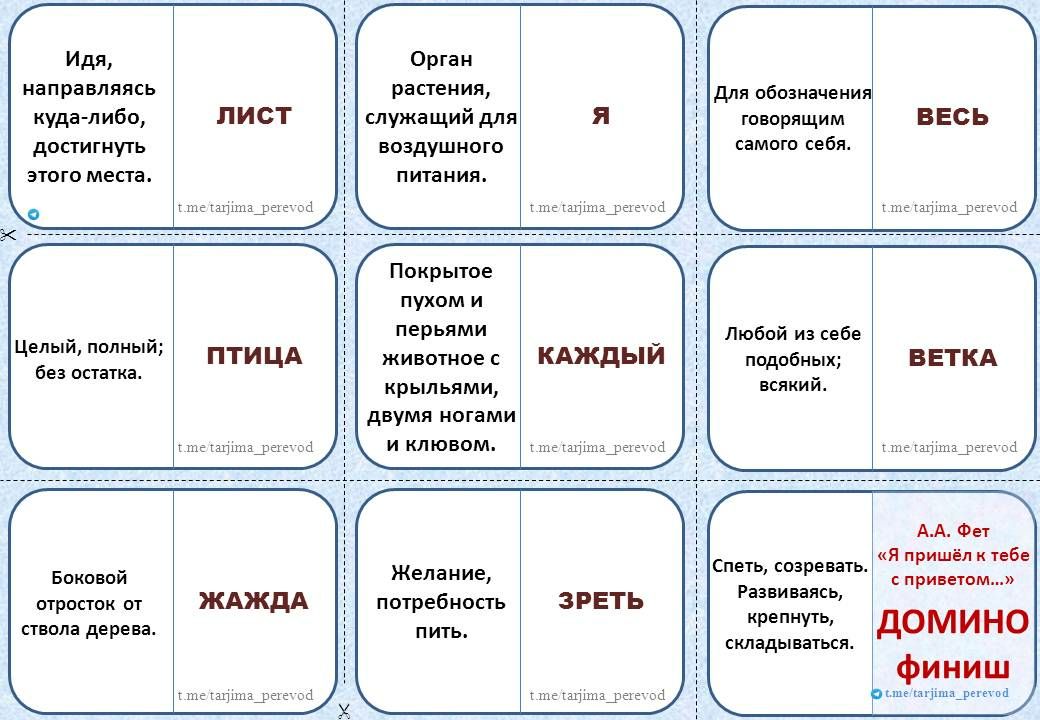 Выкладываем все слова в длинный ряд. Играем пока не дойдем до опеределения слова "зреть". Справа на этой карточке написано "Домино финиш". Игра окончена.