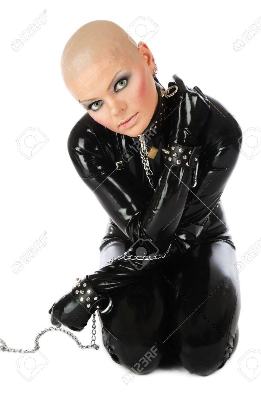 Girl in Latex mit gefesselten Brüsten stopft sich Flaschenhals rein