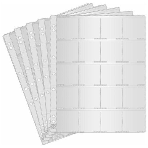 Feuille numismatique Leuchtturm Grande avec 20 pochettes spéciales pour porte-monnaies 50 x 50 mm, pack. 5 pièces Feuille de plastique transparent, dotée de 20 pochettes spéciales pour porte-monnaie 50 x 50 mm. Taille des cellules 53 x 51 mm. Dimensions de la feuille 242x312 mm. Le paquet contient 5 feuilles + 5 intercalaires en carton blanc.