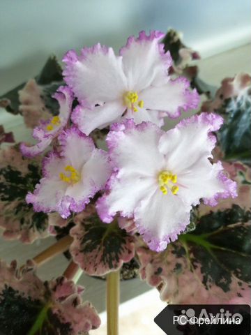 РС-Фрейлина . Крупные простые слегка волнистые бледно-розовые звезды с пышной малиново-лиловой гофрировкой по краю . Темно-зеленая волнистая пестролистная листва с розовым . Нет в наличии . 300 . . .