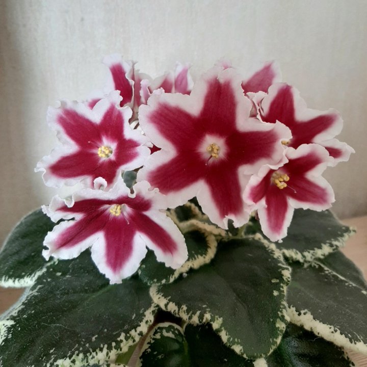 ЛЕ-Маргарита . Простые белые звезды чашевидной формы с темно-вишневыми напечатками . Пестролистные темно-зеленые с широкой бело-розовой каймой по краю листья . Вид растения: крупная детка . . .