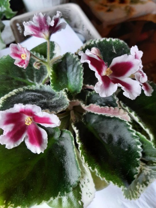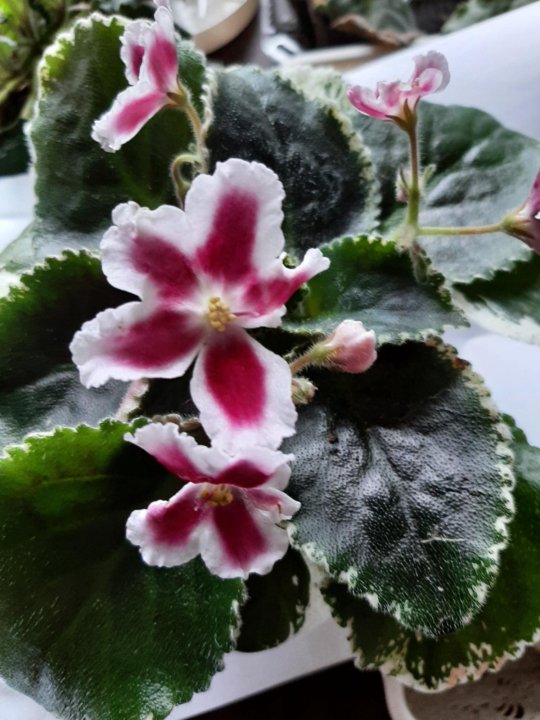 РМ-Маргарита Наваррская, лист -33% . Темно-вишневые махровые волнистые цветы с контрастной белой каймой, темно-зеленые гладкие листья . . . . Последние фото .