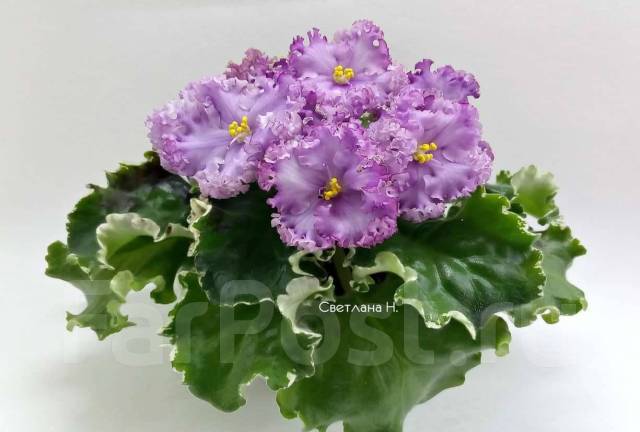 Сенполия НК-Дюк де Ришелье . Селекционер Н .Козак Фиолетово-лилово-голубые цветы с сильно витыми краями лепестков . Средне-зелёная пестролистная розетка .