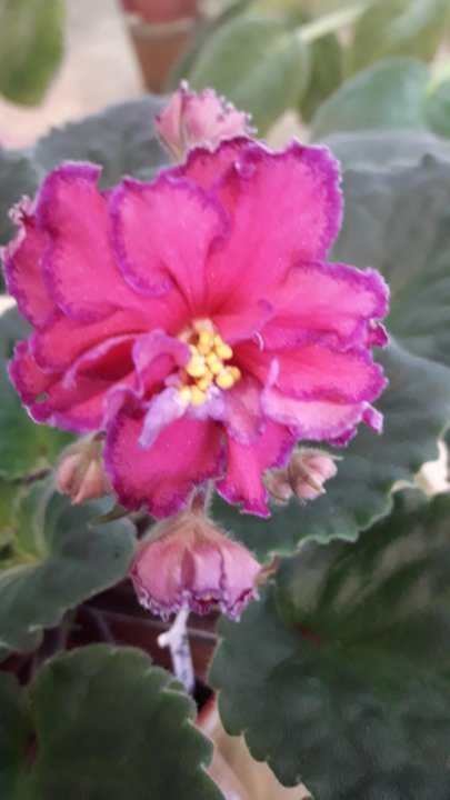Купить фиалку ВаТ-Агат Розовый . Заказать фиалку . Малиновый цветок с тёмным крапом и с широким белым волнистым краем . Пестролистная розетка .
