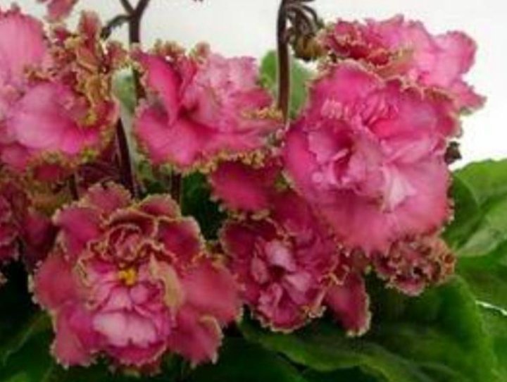 Фиалка АВ-Розовые Розы (766-23) . Цветок: Махровые розовые розовидные цветы с фантазийной малиновой каймой . Розетка: Стеганные, зубчатые, темно-зеленые листья .