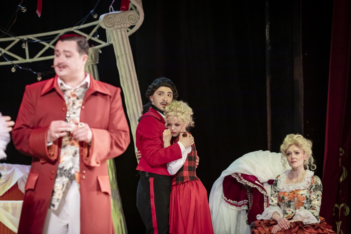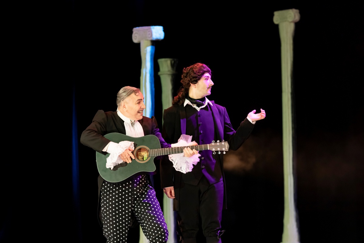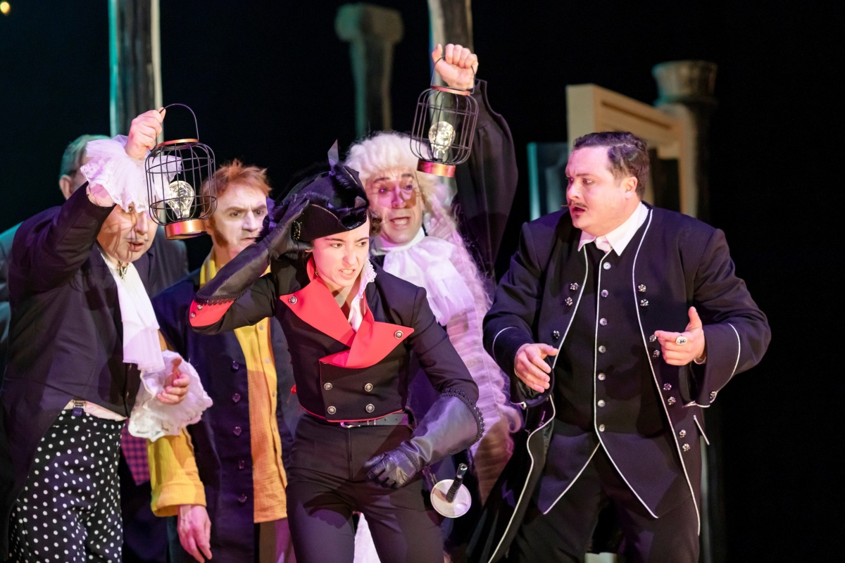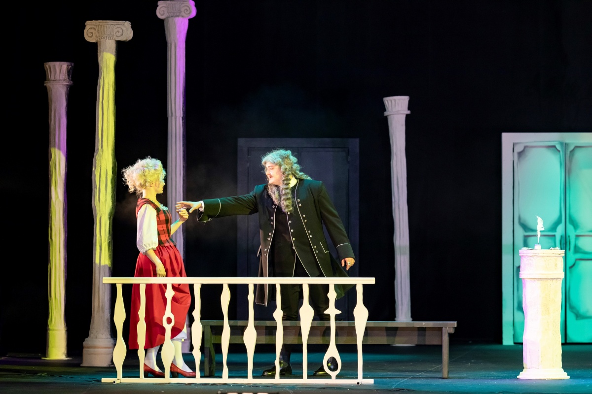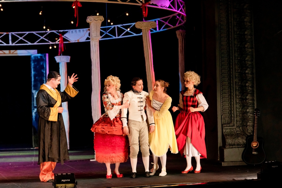 Спектакль Фигаро в Драматическом театре, классическая пьеса Бомарше с видеопроекцией, костюмами и световыми эффектами, режиссёрская работа с текстом и эпохой.