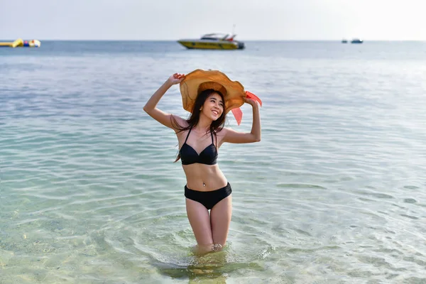 Портрет красивой смуглой филиппинки на пляже с белым . . .