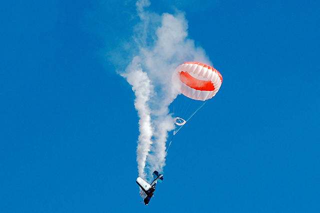 Кадр из фильма "Дни лётные" (1966) Учебный полёт завершился столкновением . Один пилот успел покинуть падающий самолет . Другой совершил жёсткую посадку и погиб .