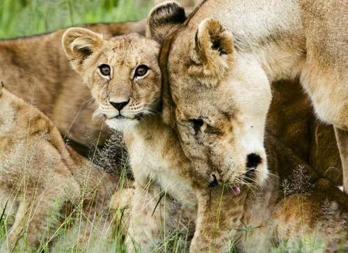 Роль льва в заботе о потомстве состоит преимущественно в охране прайда от бродячих львов-самцов . Он также может проследить, чтобы при разделе добычи львятам досталась их порция .