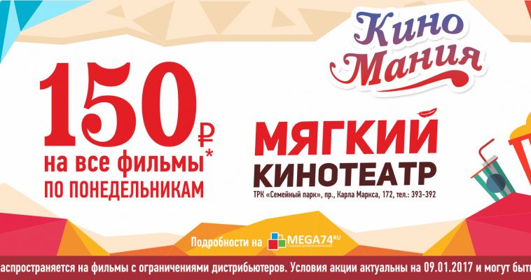 Сегодня в "Мягком кинотеатре" ТРК "Гудок" пройдет акция "Киномания" . САМАРА . 13 НОЯБРЯ . ВОЛГА НЬЮС . По понедельникам в "Мягком кинотеатре" можно посмотреть фильмы всего за 150 рублей . Акция не . . .