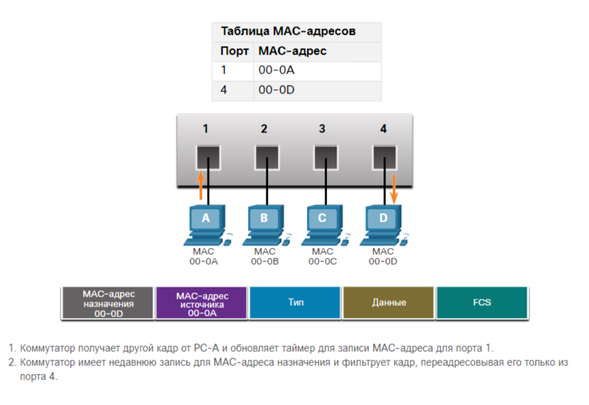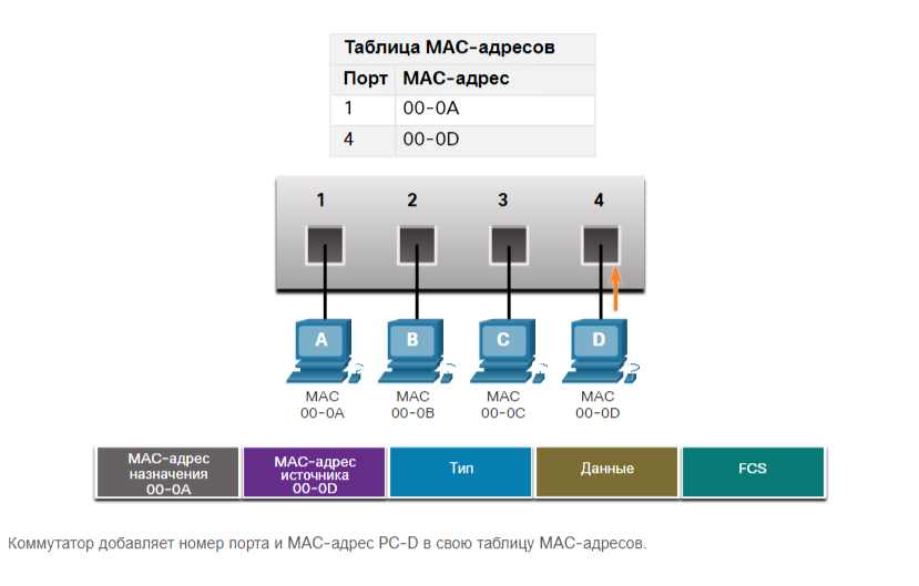 На рисунке PC-D отвечает на PC-A. Коммутатор видит MAC-адрес PC-D во входящем кадре на порту 4. Затем коммутатор помещает MAC-адрес PC-D в таблицу MAC-адресов, связанную с портом 4.