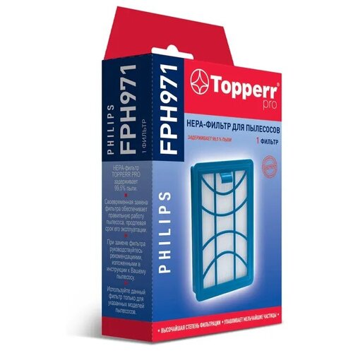 Hera-filter Topperr FPH 971 Le hera-filter TOPPERR PRO compatible possède le plus haut degré de filtration et retient 99,5% des poussières. Grâce aux propriétés particulières du matériau filtrant, le filtre capture les plus petites particules, vous permettant ainsi de purifier l'air du pollen, des micro-organismes, des bactéries et des acariens. Type de filtre d'origine : CP0616/01. Ce filtre convient aux modèles d'aspirateurs suivants : Philips PowerPro ExpertFC9728/01FC9732/01FC9733/01FC9734/01FC9735/01FC9729/09FC9741/09FC9742/09FC9743/09FC9744/09FC9745/09FC 9746. /09FC9750/07FC9751/ 07
