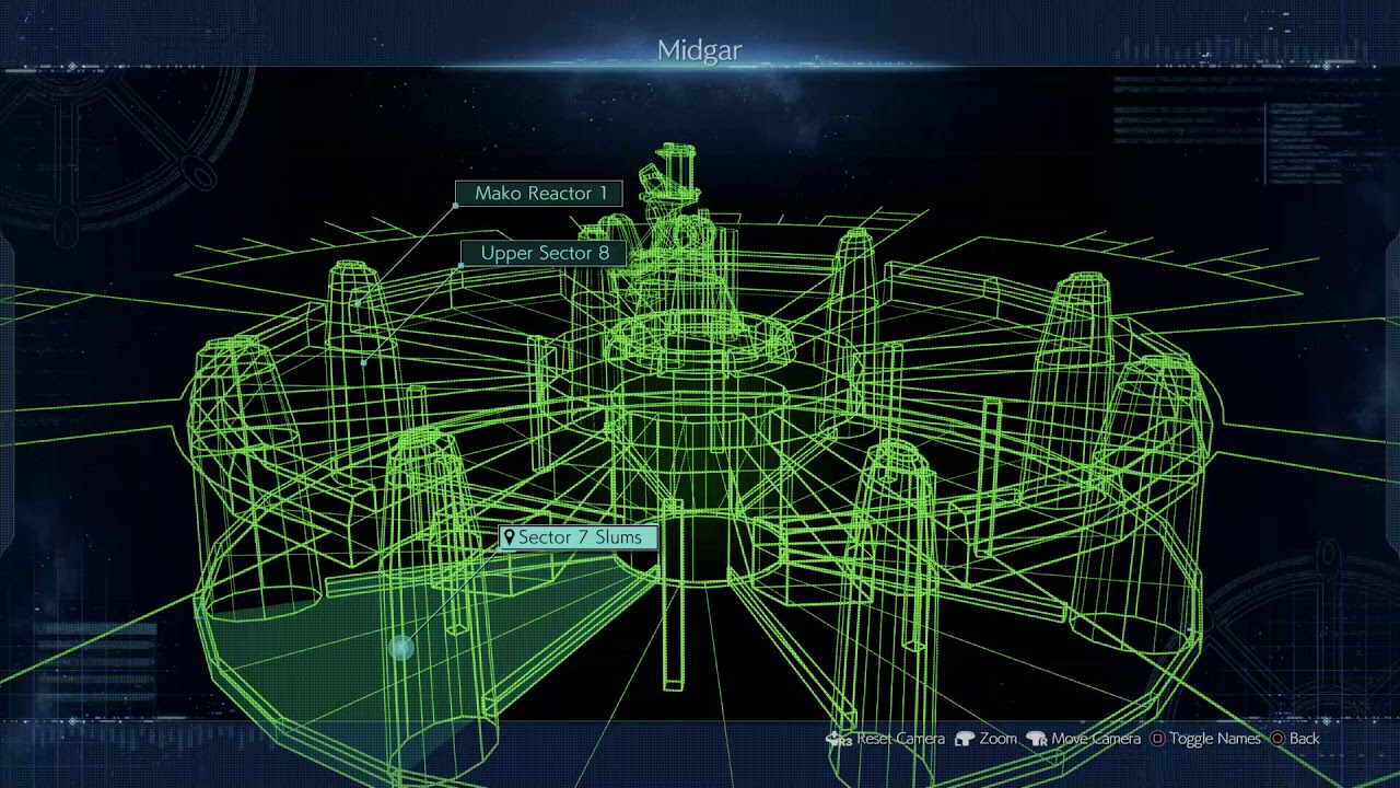 До речі, тут можна побачити схему Мідгара. В центрі - основний бізнес центр або штабквартира Шинри, а по колу йдуть сектори та реактори. Під секторами знаходяться Нетрі.