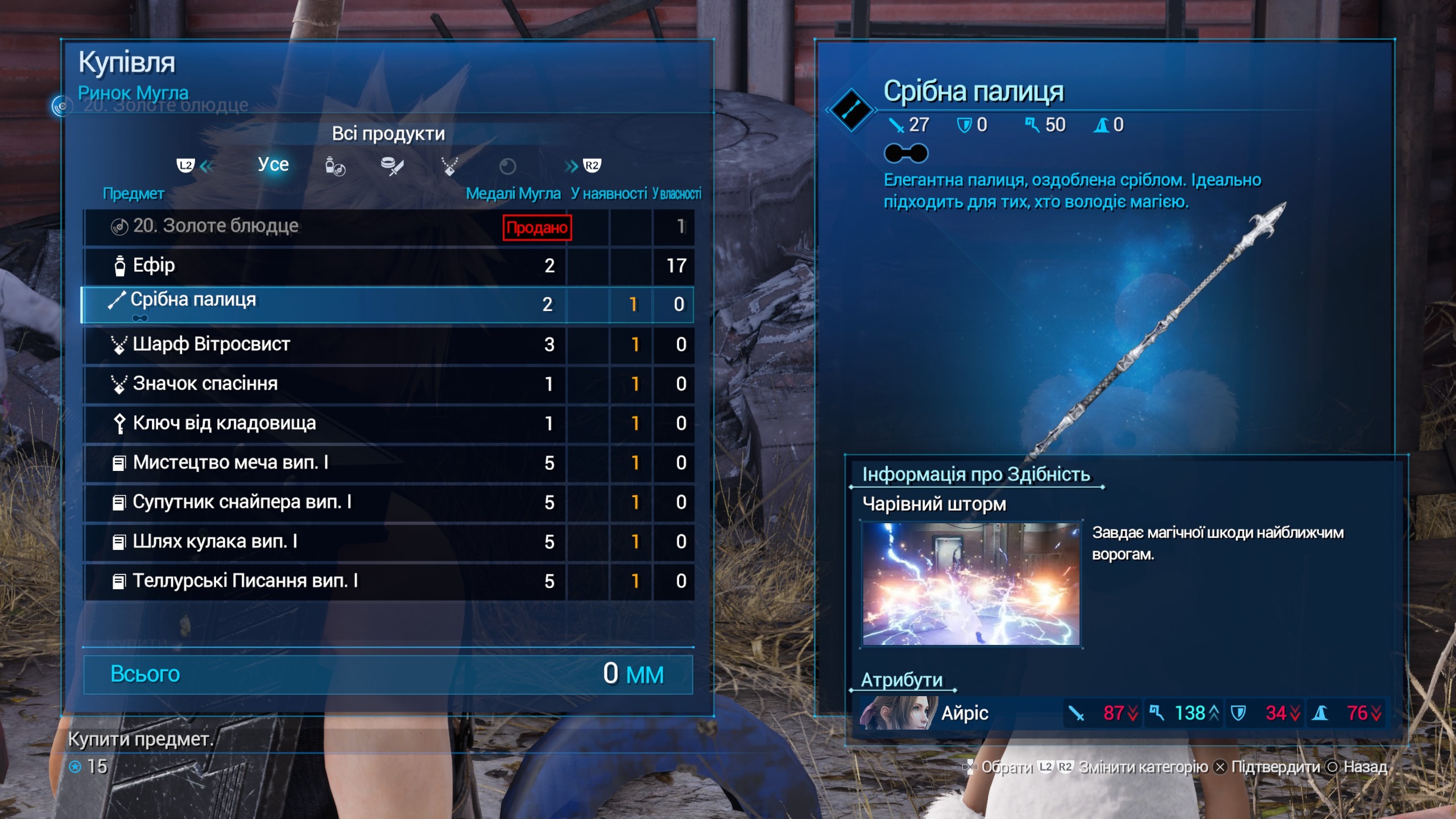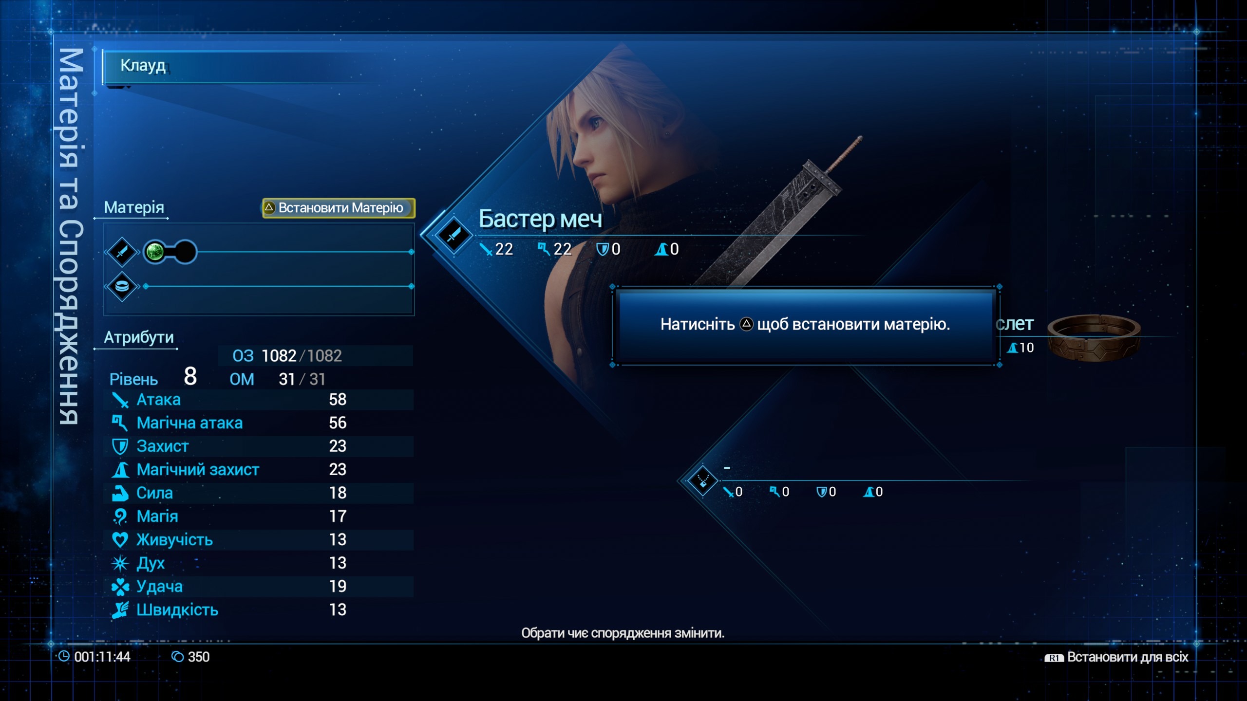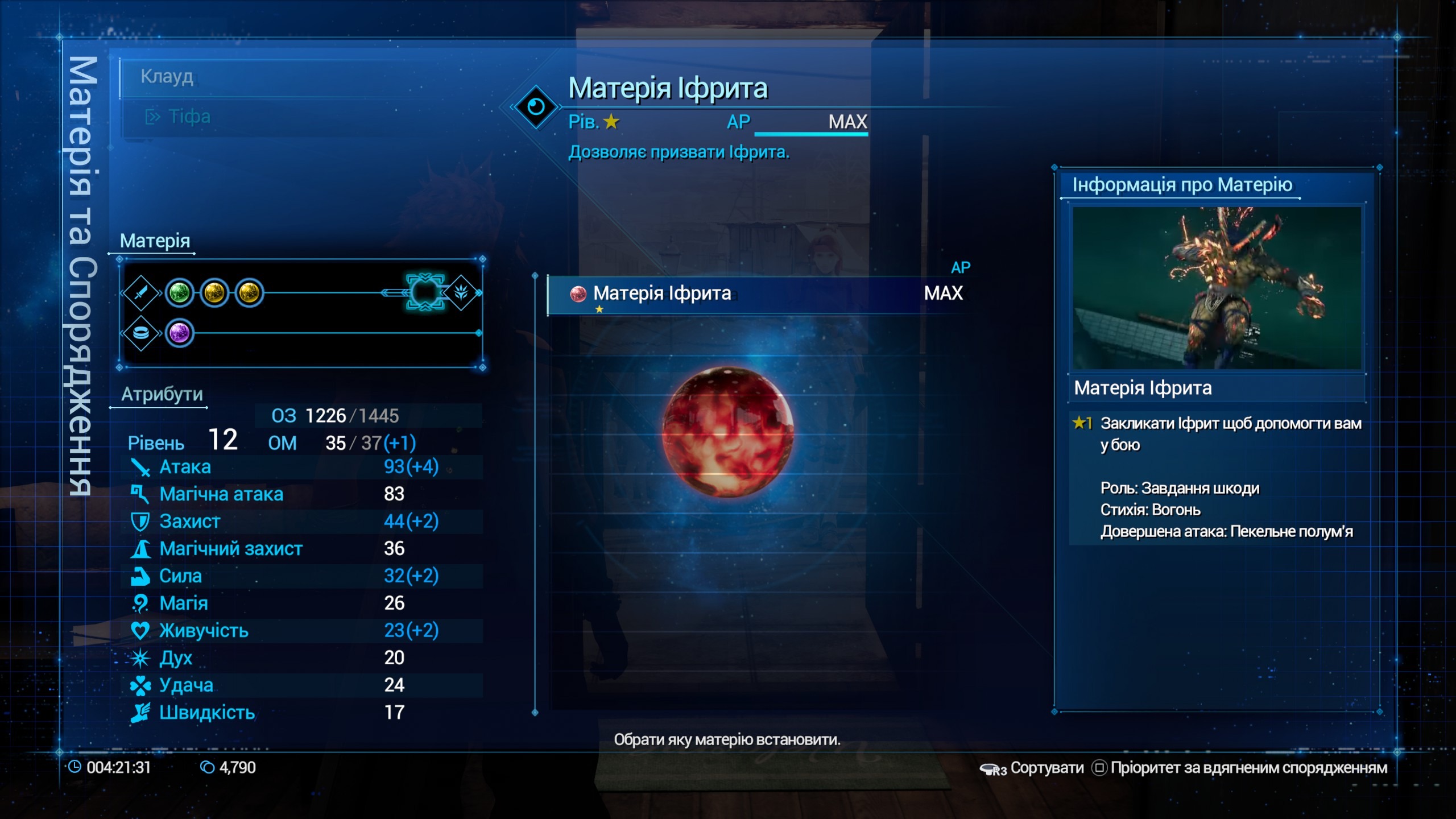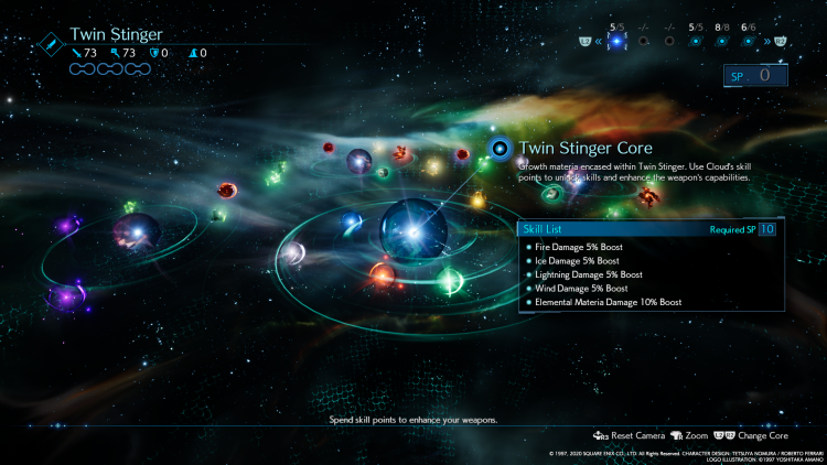 До речі, про матерію. Вони є скупченням, концентратом енергії мако, тої самої мако, що видобуває Шинра. Матерії є різні, наприклад, магічні зелені матерії, матерії, які бустять характеристики (фіолетова), матерії, що бустять іншу матерію (синя), матерії-команди, що не потребують мани (жовті). Також, є унікальні матерії - самони, якими можна користуватись тільки під час бос файтів. З використанням матерії - вони апгрейдяться, наприклад, вогняна матерія може бути 2 та 3 рівня, тоді в персонажа будуть доступні відповідні заклинання. Більше рівень заклинання - більше витрачається мп, але і урона більше. Всього є 4 стихії - вогонь і лід, блискавка і вітер, як правило вони йдуть парою, тобто істота, що має імун або опір до вогню, буде мати вразливість до льоду.