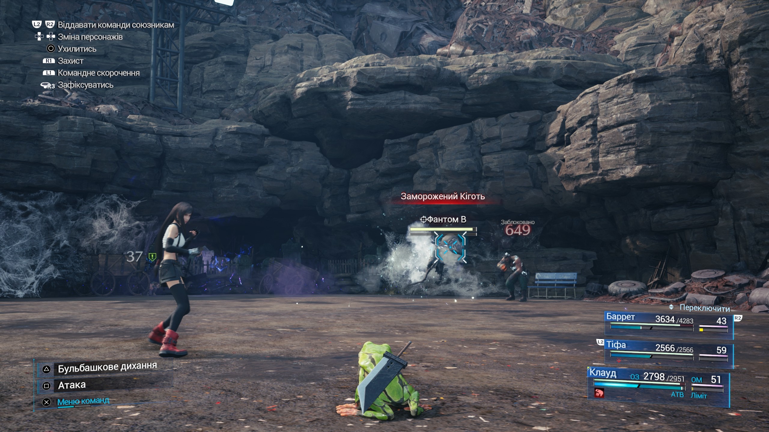 Сам бій виглядає так - ви натрапляєте на рандомний або спроектований по сюжету енкаунтер. У кожної істоти є хп, мп, а у загону є також щось, що називається ATB (Active Time Battle) - шкала, яка заповнюється, коли персонаж атакує або захищається. В бою ви можете контролювати тільки одним персонажем, тобто захищатись, переміщуватись, доджити атаки та самому атакувати, в той час, як за інших персонажів грає бот. Тим не менш, можна заходити в "Меню команд" і обирати дію, яка активна, коли ATB заповнено - наприклад, можна використати абілку персонажа, магічну здібність, саммон або айтем. Також, кожен персонаж має свій унікальний Ліміт - здібність, яка має свою шкалу і може бути використана після тривалого бою.