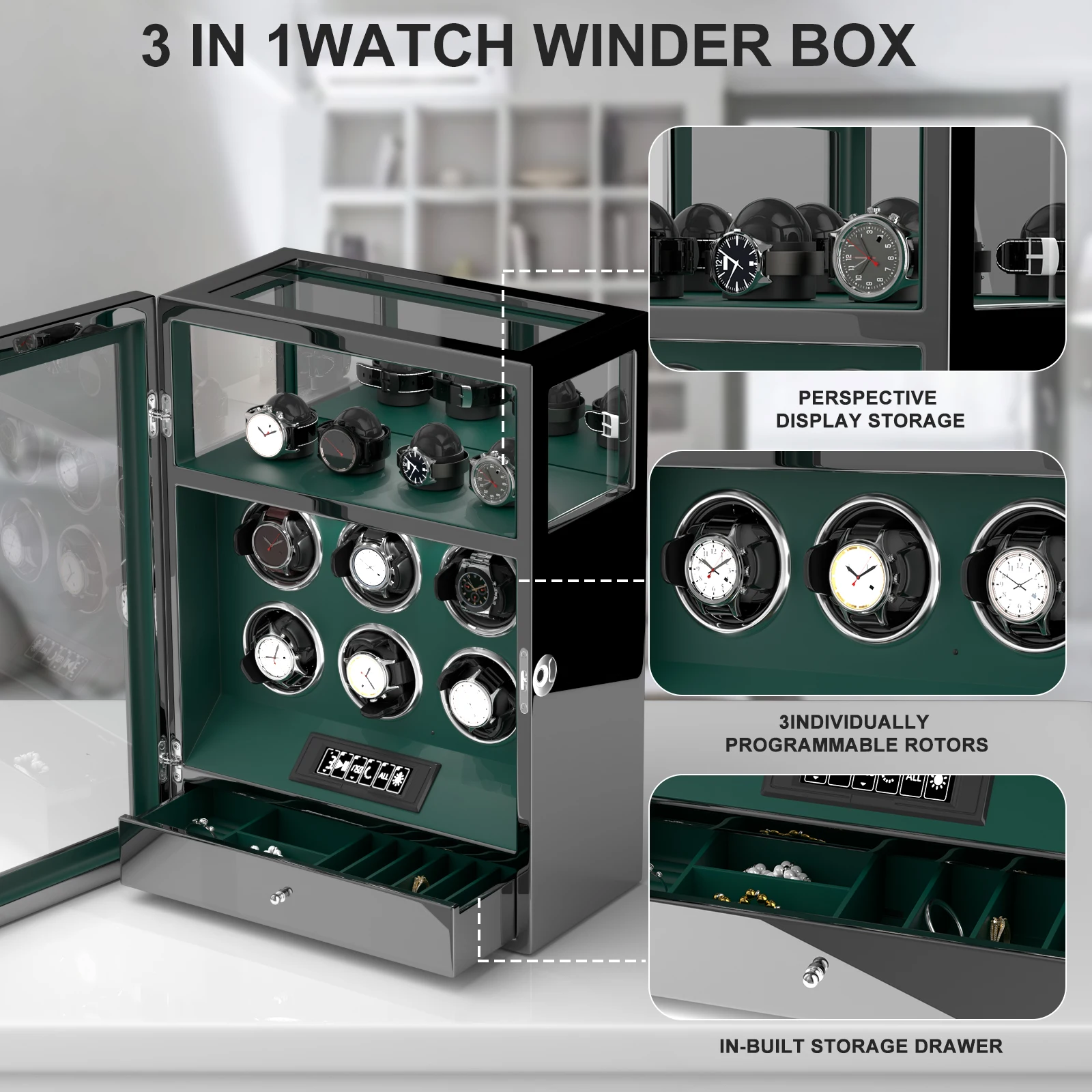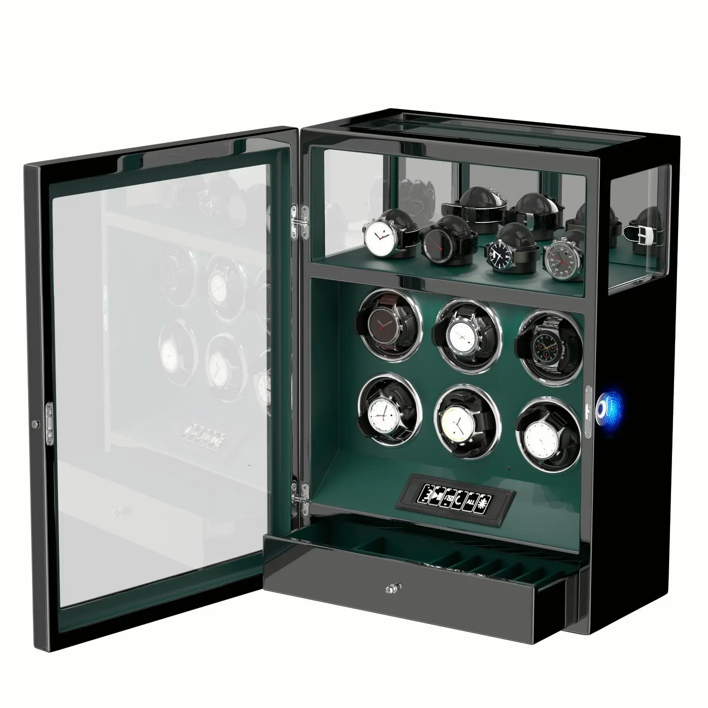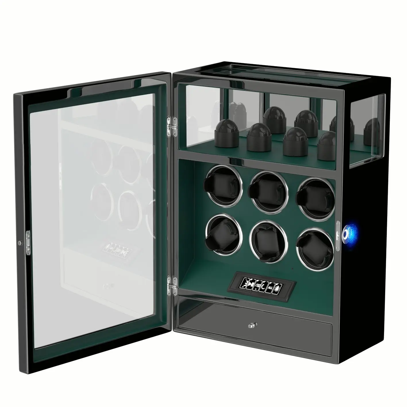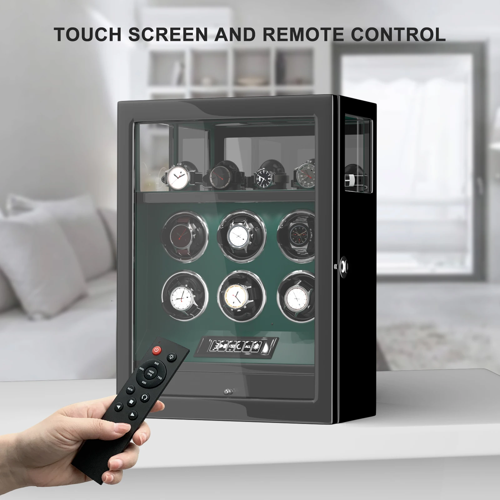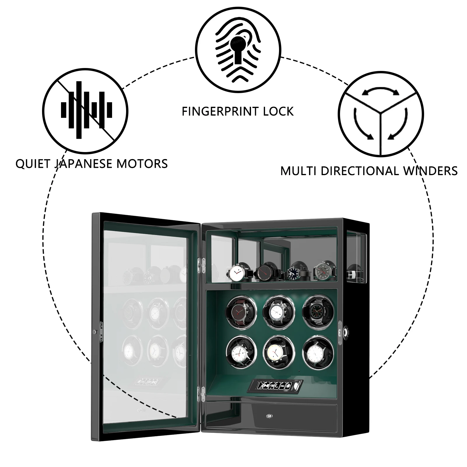 KWBpXKQTGaHere you can buy Fingerprint Unlock Watch Winder Automatic Rotation Smart Remote Control Touch Screen Watch Box 6 Watches Storage Box with free delivery to your post office.