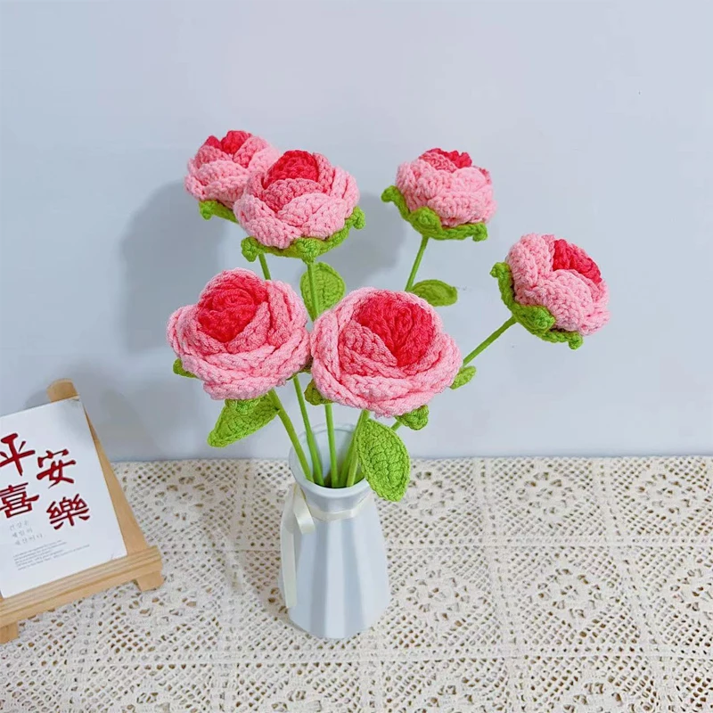 Finished Handmade Knitting Pink Gradient Roses Simulation Flowers Wool Crochet Flower Home Desktop Decorative Ornaments - Купить с бесплатной доставкой