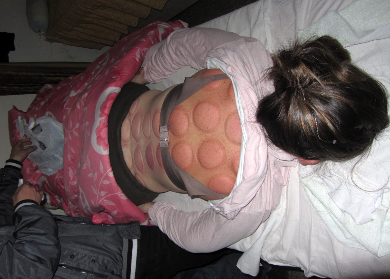 Fire cupping typically leaves small, round marks on the body that may last for days. If a single area is cupped again and again, a deep bruise may form and not disappear for some time.