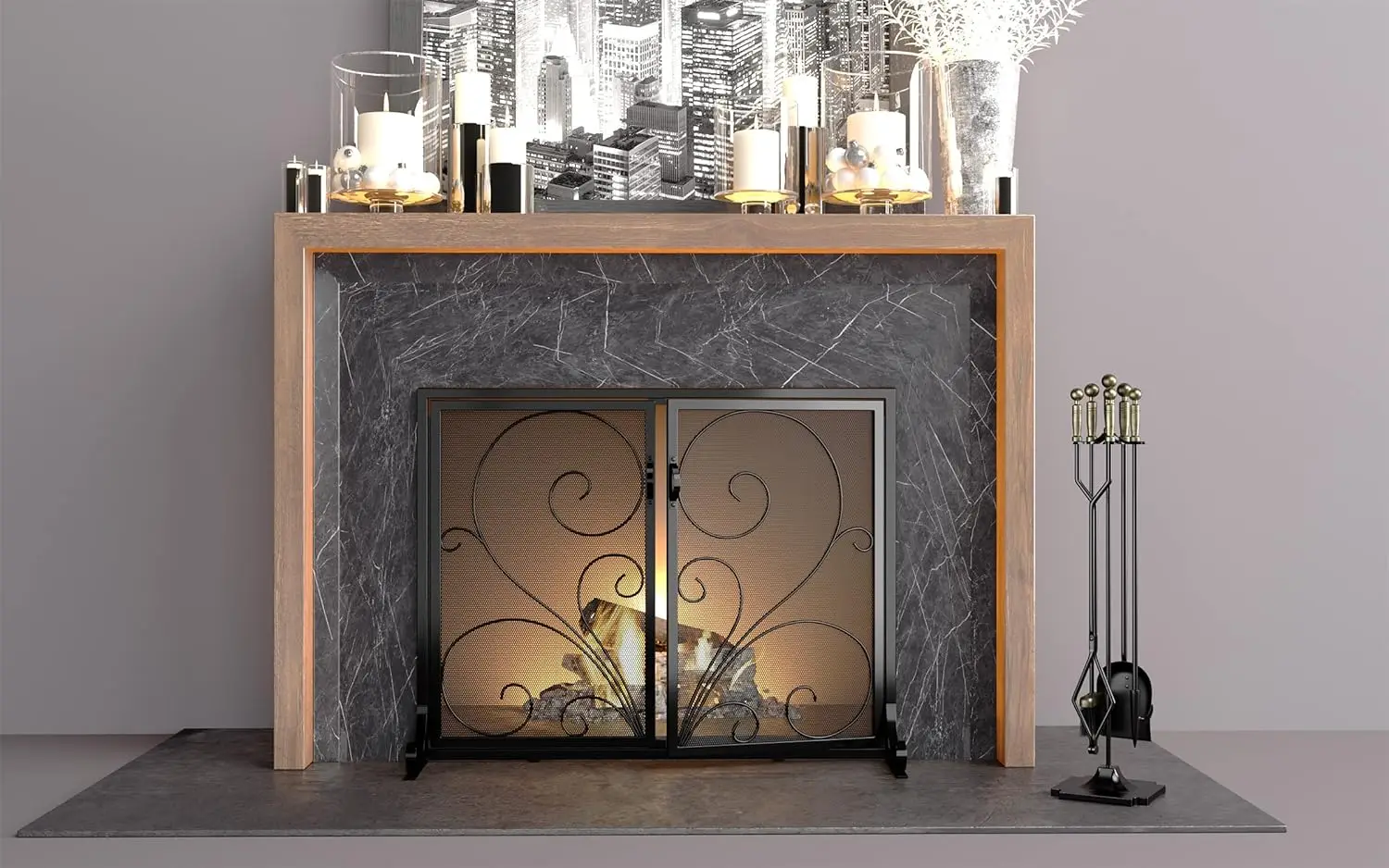 "Fireplace Screen with Doors,Solid Wrought Iron Frame with Metal Mesh, Flat Panel Decorative Fireplace Screen with Scroll Design," * Buy Now With Free Shipping Just For $76