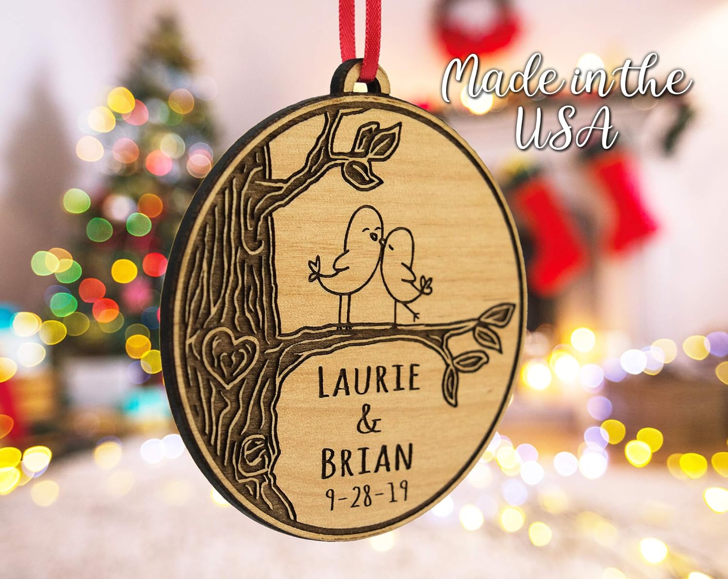 Celebrate your first Christmas together as a couple with this personalized ornament . Made by hand, it features a charming couple painting and is customized with names and a date .