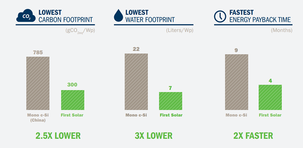 В рамках концепции ответственной солнечной энергии First Solar обратила внимание на эту проблему. Компания является единственным крупным производителем панелей из теллурида кадмия. Это решение позволяет в 2,5 раза снизить углеродный след, в 3 раза снизить потребление воды и в 2 раза ускорить окупаемость по сравнению с панелями из кристаллического кремния, использующиеся в большинстве случаев.