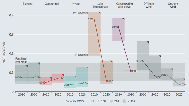 За последние 10 лет удалось добиться снижения себестоимости солнечной энергии в 6,7 раз до 57$. Учитывая, что ни углеводородная, ни возобновляемая энергетика не смогли показать столь существенного улучшения эффективности, солнечная энергетика стала одним из самых дешевых способов генерации электричества. По прогнозам, стоимость производства энергии с помощью панелей уже в 2022 году может снизиться до 39$, что сделает этот способ получения энергии самым дешевым.