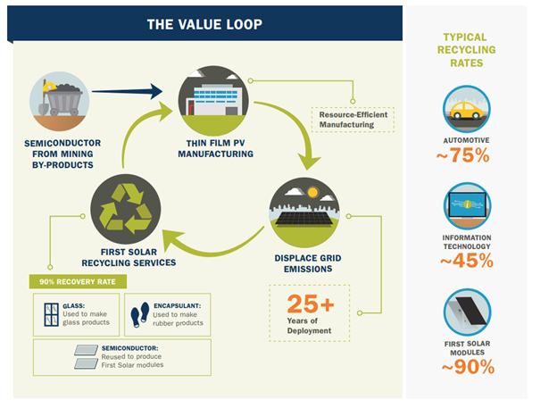 Важнейшее преимущество продуктов First Solar проявляется уже после окончания их срока службы. Панели компании легко утилизируются и 90% полученных веществ можно использовать для производства новых солнечных батарей. Их можно перерабатывать до 40 раз и генерировать энергию на протяжении 1230 лет при помощи одних и тех же материалов.
