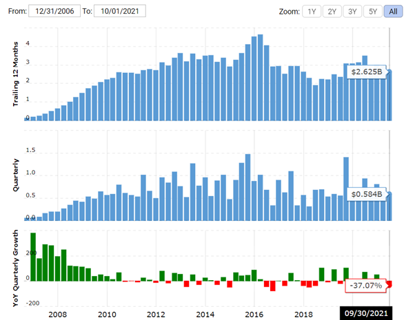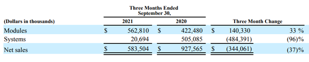 По итогам прошлого года FSLR показала выручку на уровне 2011 года, а за последние 5 лет доходы компании значительно снизились. В 2015 году они составляли 4,1b $, а в 2020 – 2,7b $, CAGR (-8%). По прогнозам, First Solar не удастся показать рост выручки и в ближайшие 2 года. В 2015 году компания приняла решение отказаться от сегмента «Системы» в пользу быстрорастущего направления производства и розничных продаж. На тот момент услуги и продукты для корпоративных клиентов приносили FSLR 93,6% выручки. С тех пор доходы от «Систем» снизились с 3,3b $ до 600m $, а их доля в продажах по итогам 9 месяцев 2021 года упала до 18,6%. Сегмент «Модули» действительно показал высокие темпы роста (CAGR за 5 лет составил 50,2%), но не смог полноценно компенсировать падение выручки от другого направления.