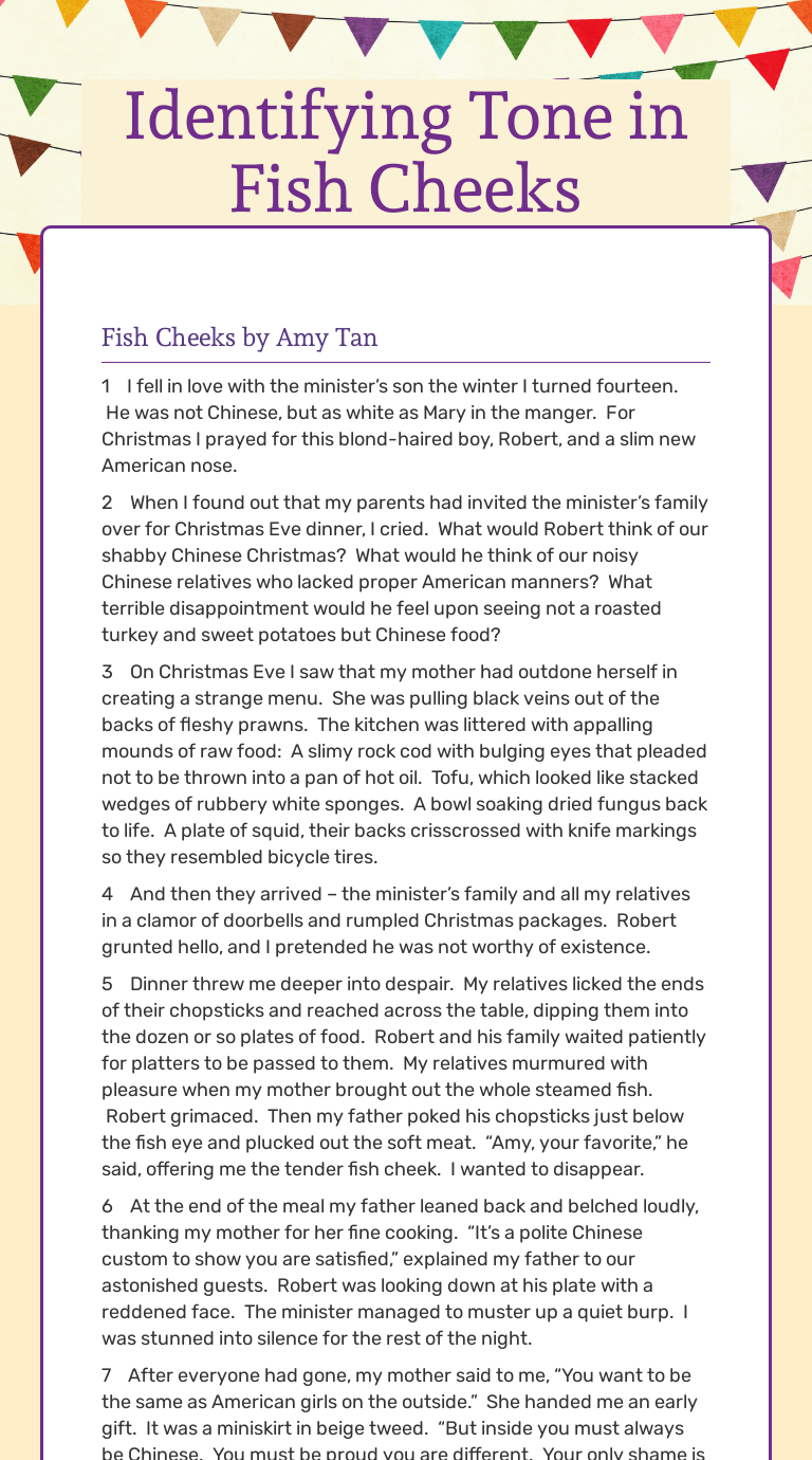 Fish Cheeks . The passage " Fish Cheeks " written by Amy Tan is a short based on Amy Tan's personal experience as a typical Asian girl growing up in an American culture . Amy's only wishes that her and her family were more American so that she could fit the modern American world . She has a huge crush on a boy named Robert, who is the . . .