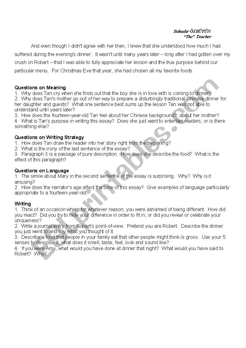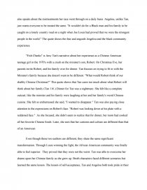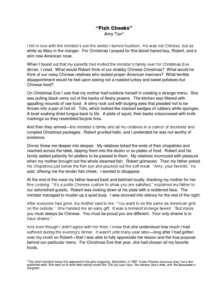 In Amy Tans essay Fish cheeks she just wants to be like everyone else . Her mother tells her she can change how she dresses But inside you will always be Chinese(Tan 353) . Her mother invites her crushes family over for Christmas Eve dinner . On that particular Christmas Eve Amy Tan experiences a flood of feelings from nervousness, to . . .