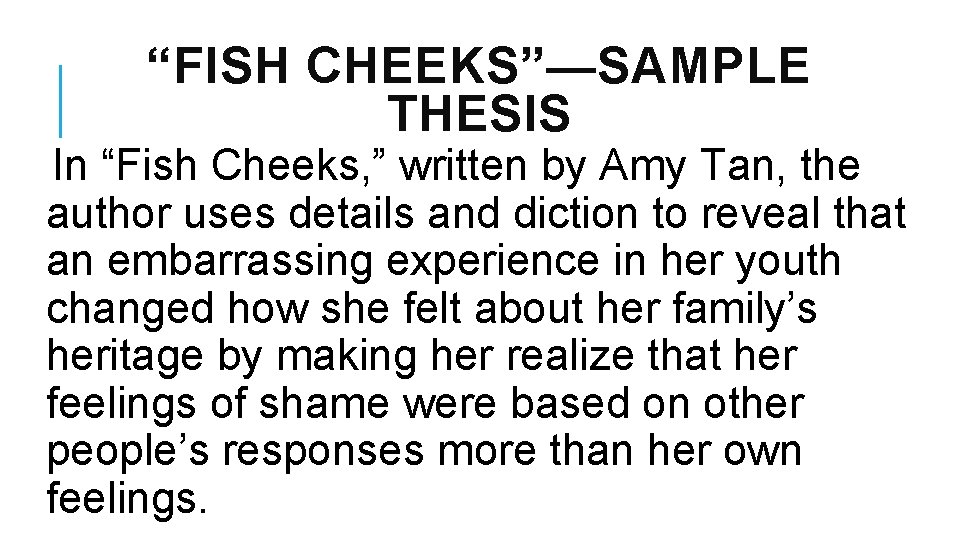 Fish Cheeks Theme Analysis . In the autobiographical story Fish Cheeks , Amy Tan compares her point of view at Christmas dinner with other people at the same Christmas dinner to highlight her cultural shame . The embarrassment that Tang feels about his culture is the main point of view portrayed in this narrative .