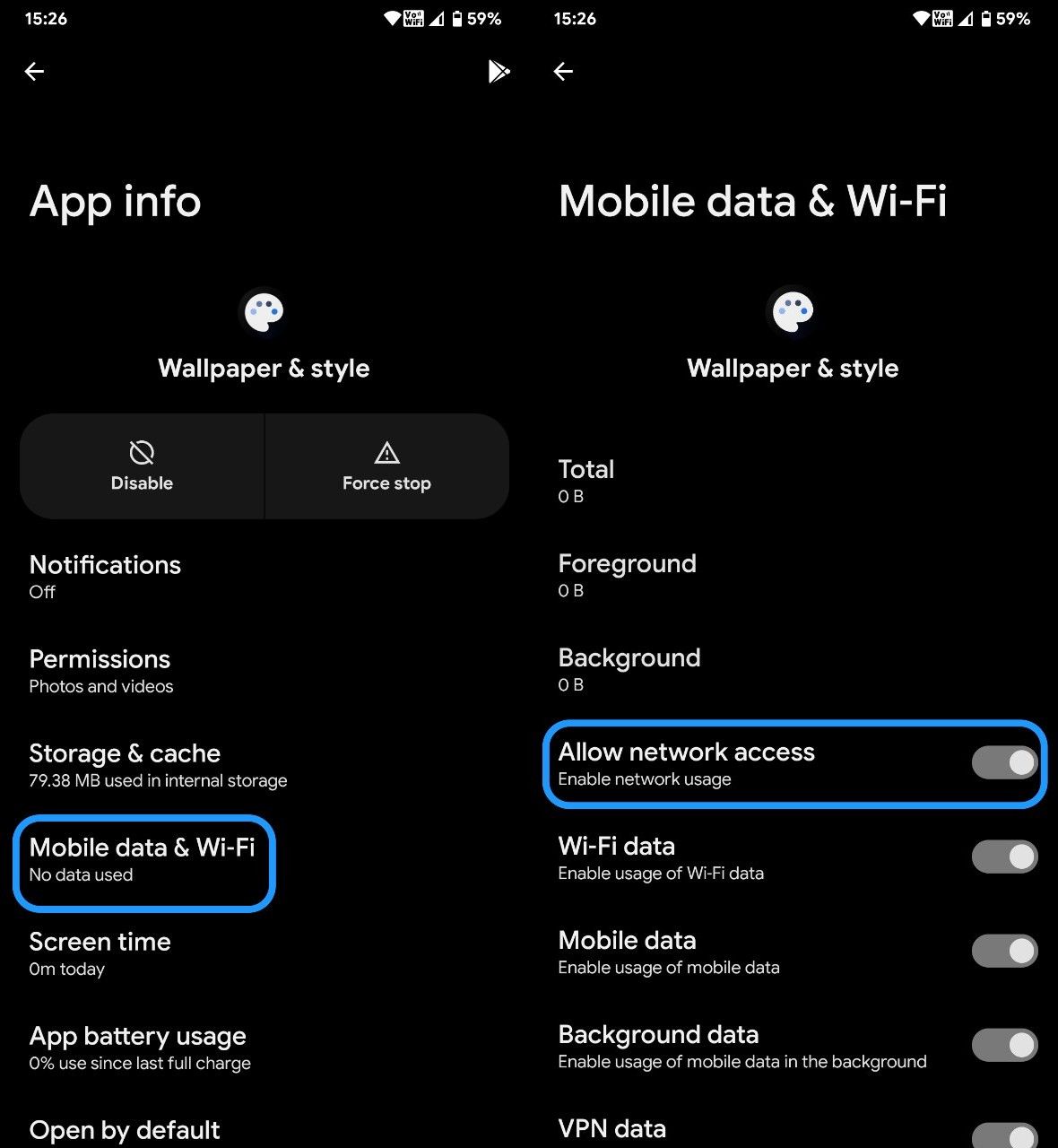 After entering the App info of "Wallpaper & Style" click on "Mobile data & WiFi" and then turn on "Allow network access" Toggle.