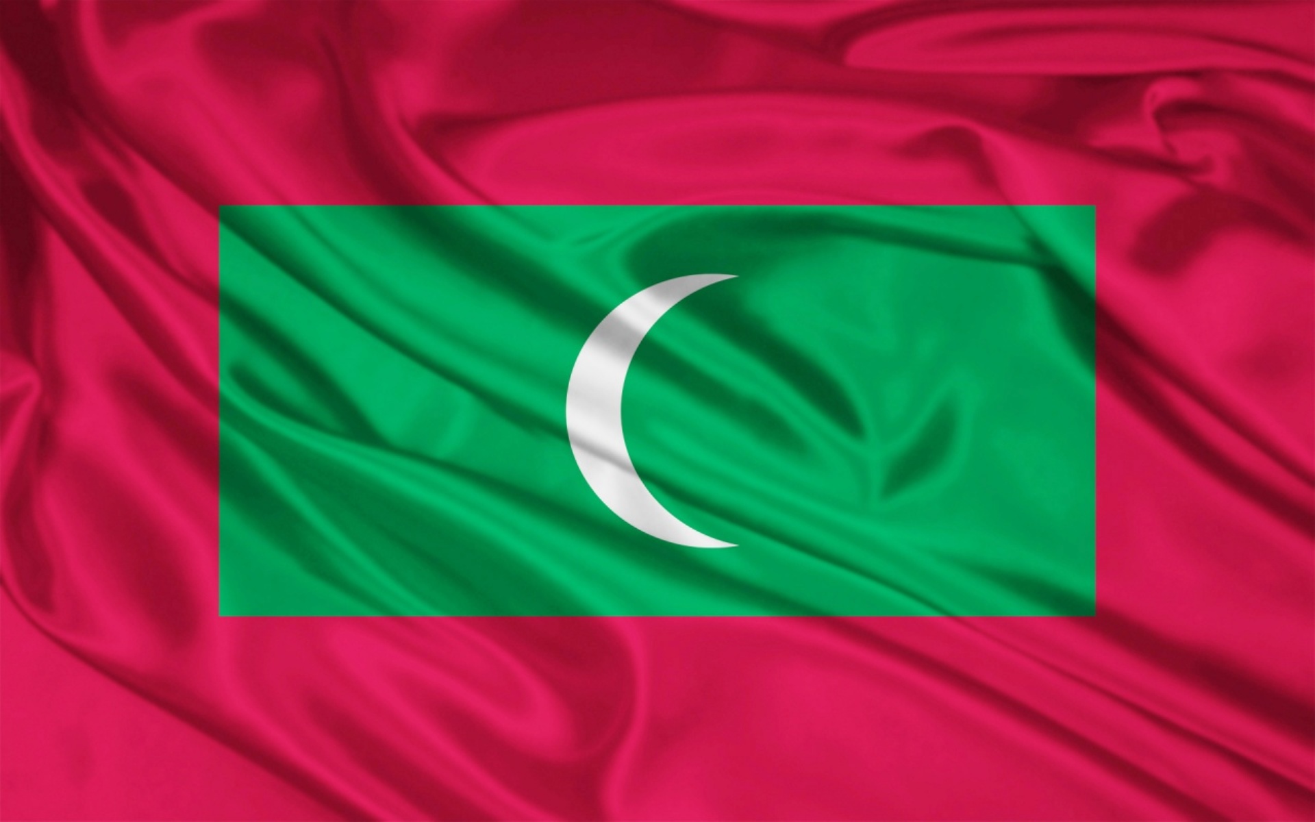 На флаге Мальдив: Красное полотнище с зелёным прямоугольником в центре Белый полумесяц на зеленом фоне в центре флага Значение и история флага Мальдив: Флаг Мальдивской Республики был принят 25 июля 1965 года .