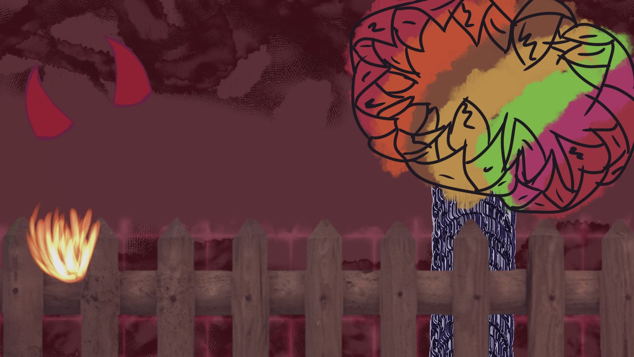 『 Вид из сада, где растёт редкое дерево — Šadę-Laię. Забор только начал гореть, ведь дерево самоподжигается, и искры пламени разбегаются в разные стороны.』