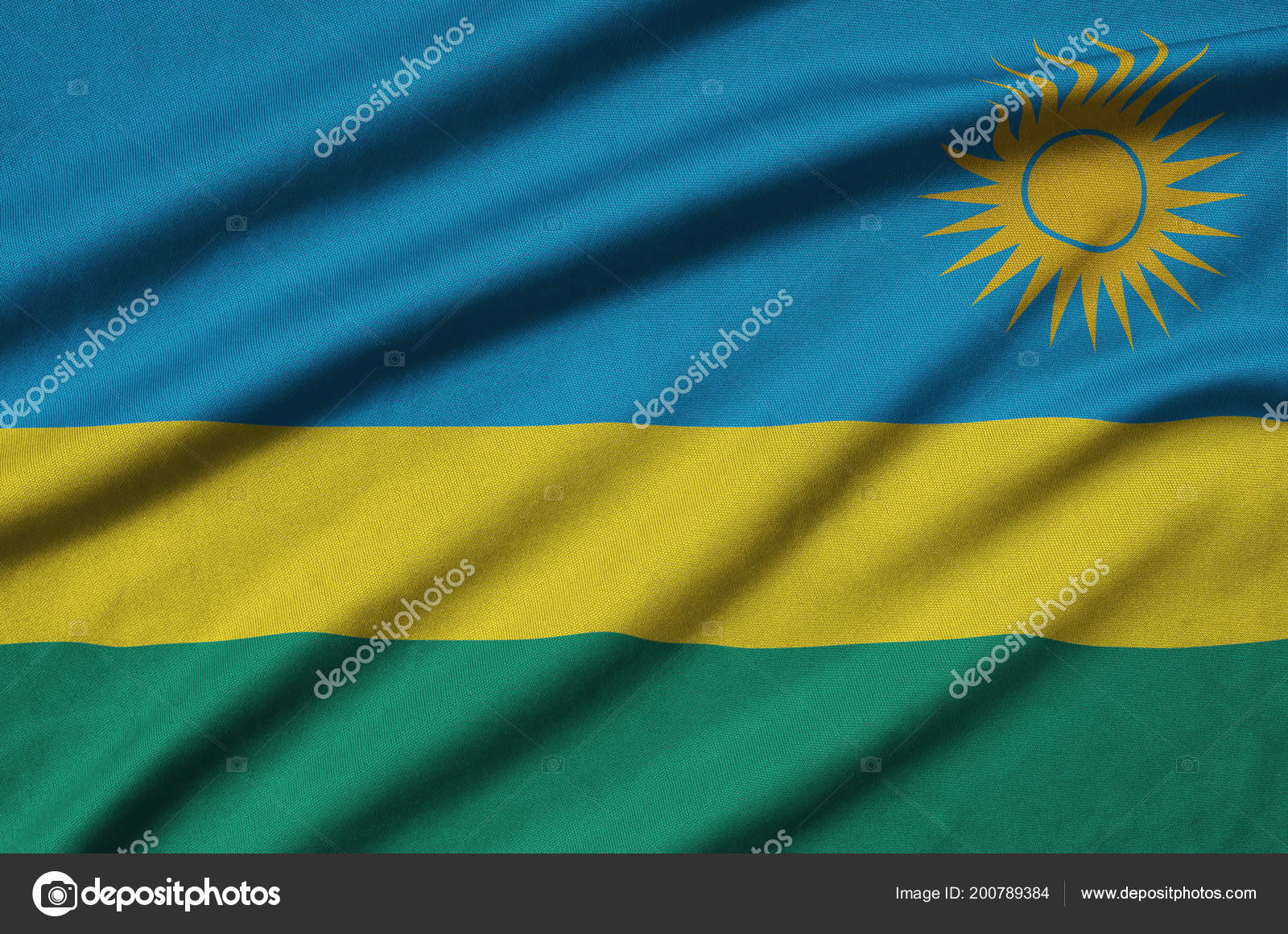 Флаг Руанды: Флаг имеет три цвета: верхняя половина флага синяя, нижняя половина поделена вдоль на две равные части — жёлтый над зелёным . В правом углу синей полосы изображено солнце с лучами .