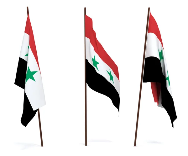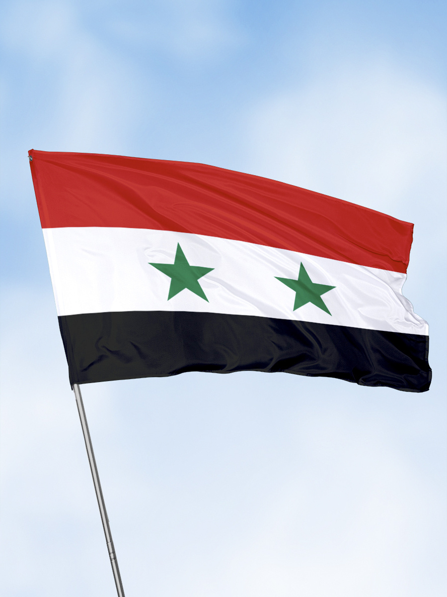 Флаг Сирии . Три полосы одинаковой ширины: красная, белая и черная . Две зеленые пятиконечные звезды симметрично расположены на белой полосе, на расстоянии 1/3 длины флага друг от друга . Цвета . . .