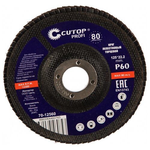 Flap zımpara taşı Cutop 70-12560 profesyonel ve günlük kullanım için kullanılır. Aşındırıcı malzeme – kalsine alüminyum oksit, 80 bıçak, 10 derece eğim açısı, 0 verimlilik, artırılmış aşınma direnci.
